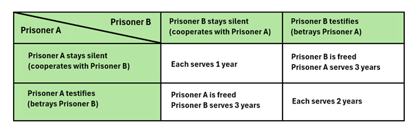The Police offer a deal to each prisoner. If a prisoner testifies that the other prisoner committed the serious offence and the other stays silent, he will be released whilst the other prisoner will serve 3 years. If both prisoners testify against each other, they will both serve 2 years. If both prisoners stay silent, they will serve 1 year (for the minor offence).